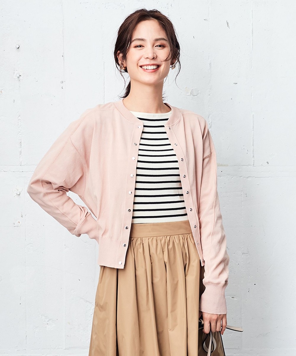少しボーイッシュなディティールを入れる事でカーディガンよりサマ見えします。