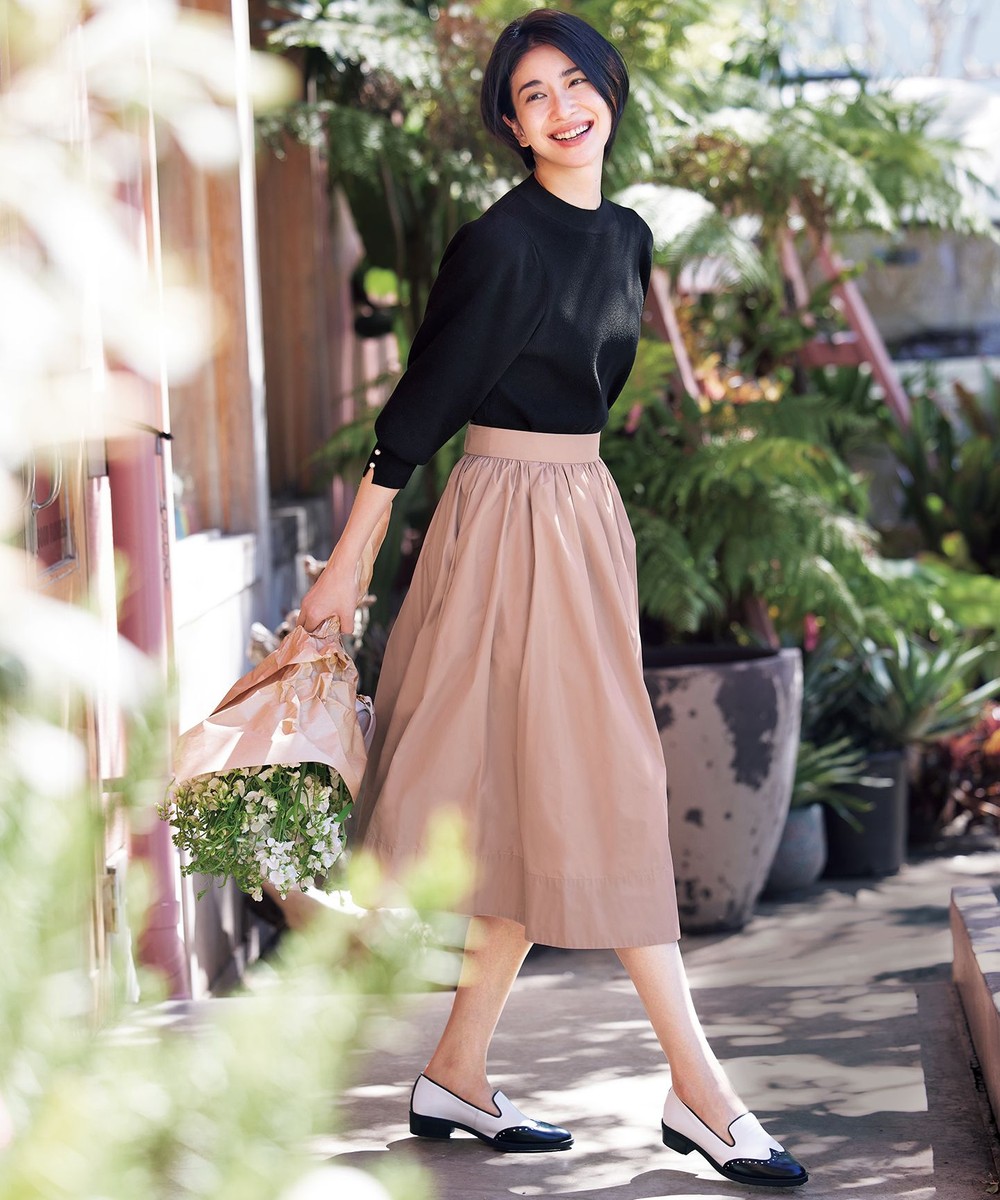 長すぎず短すぎずの絶妙な丈感でパンプスやブーツ、スニーカーなど合わせる靴によってキレイ目にもカジュアルにも着まわせます。