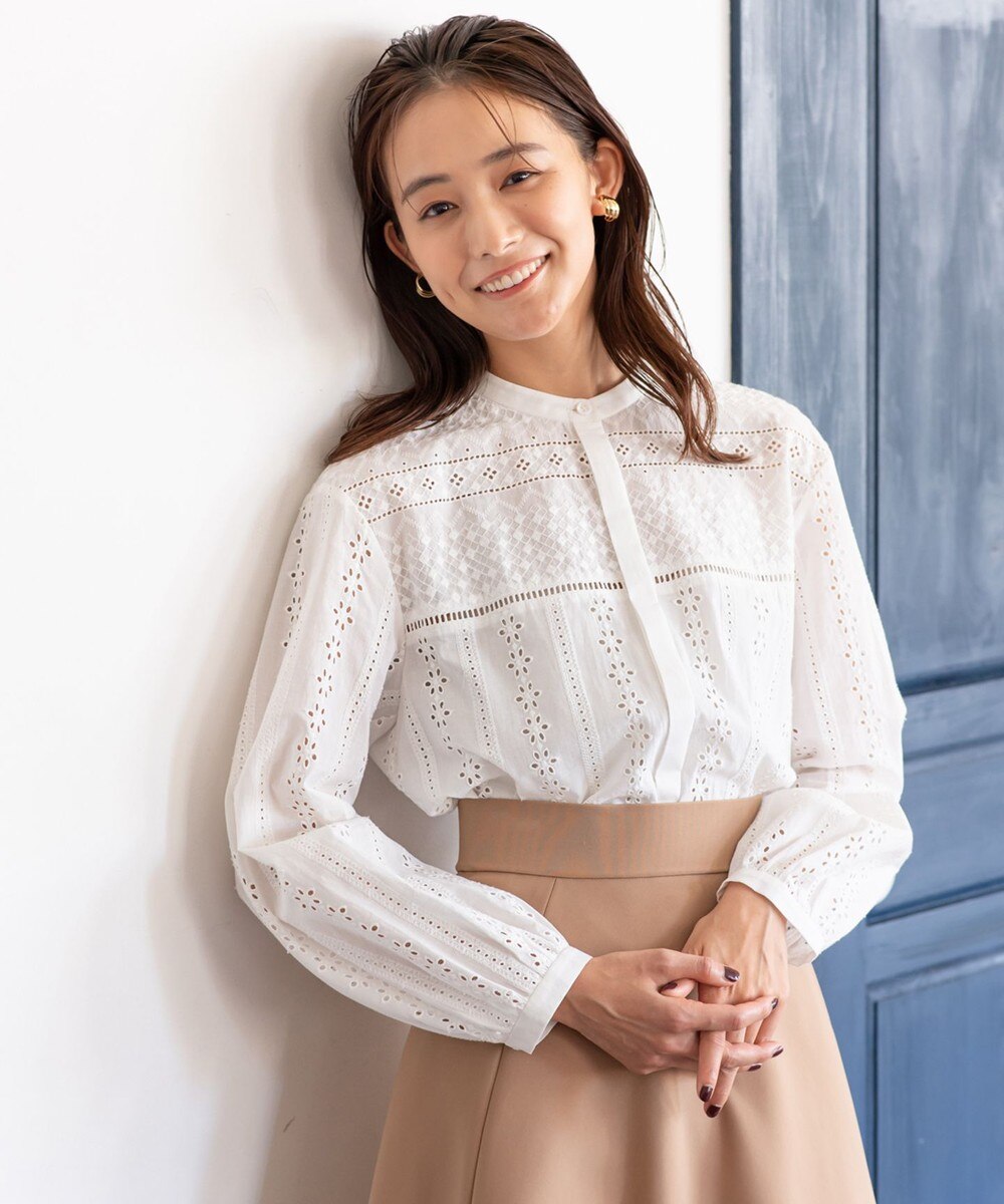 送料無料 2021AW1枚で着映えする、シーズンレスで使えるシャツライクな刺繍ブラウス■デザイン大き目なフラワーカッティングながら、さらりとしたシルエットや比翼仕立てで、洗練された印象を残したデザインのブラウスです。