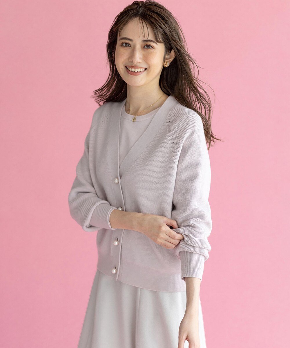 カーディガンは凹凸感のある畦編みで、ラグラン切替のラインに沿って入れたアイレット柄やパールボタンが組曲らしいエッセンスをプラスしています。