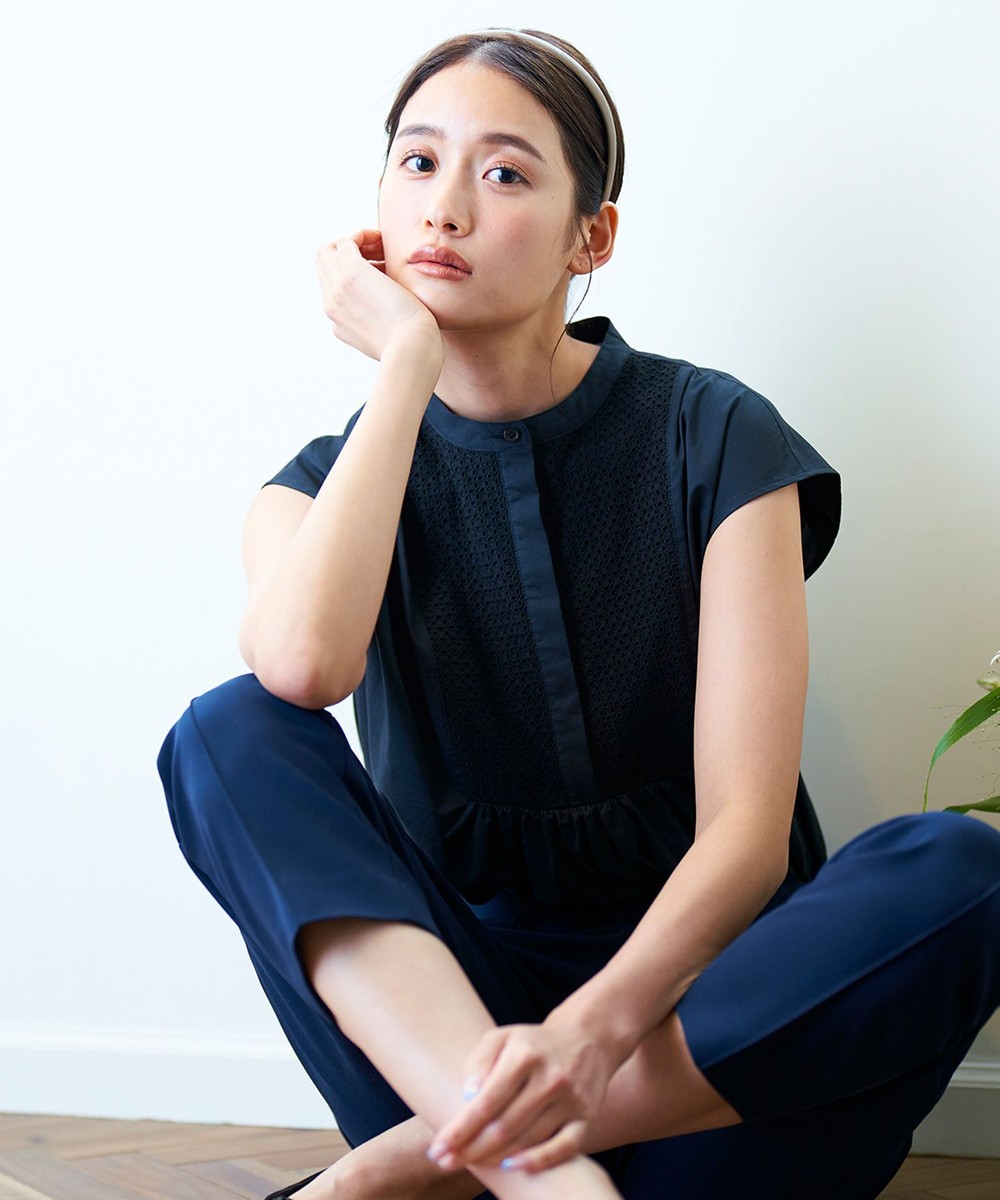 シックなネイビーとホワイトの2色展開で刺繍でも甘くなりすぎず、大人っぽく決まるブラウスです。