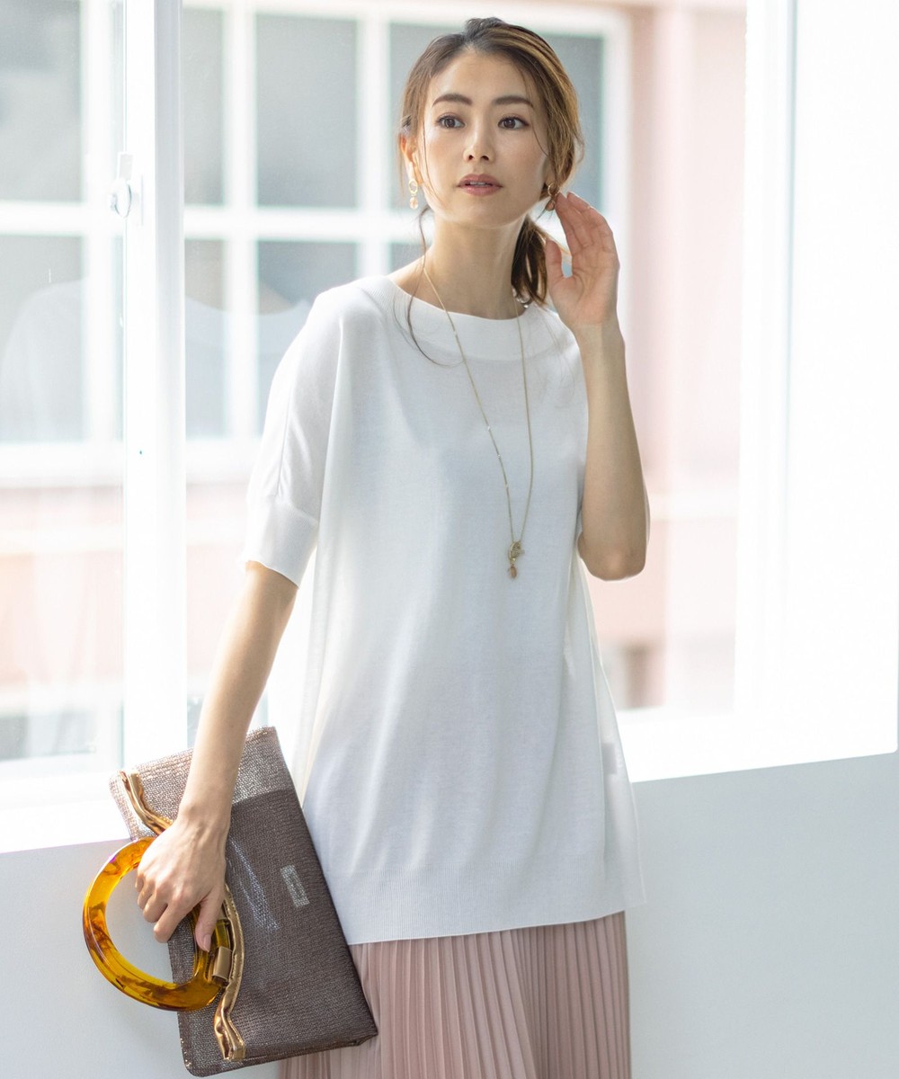 おさまりの良いボートネックが程よく女性らしさをプラス。