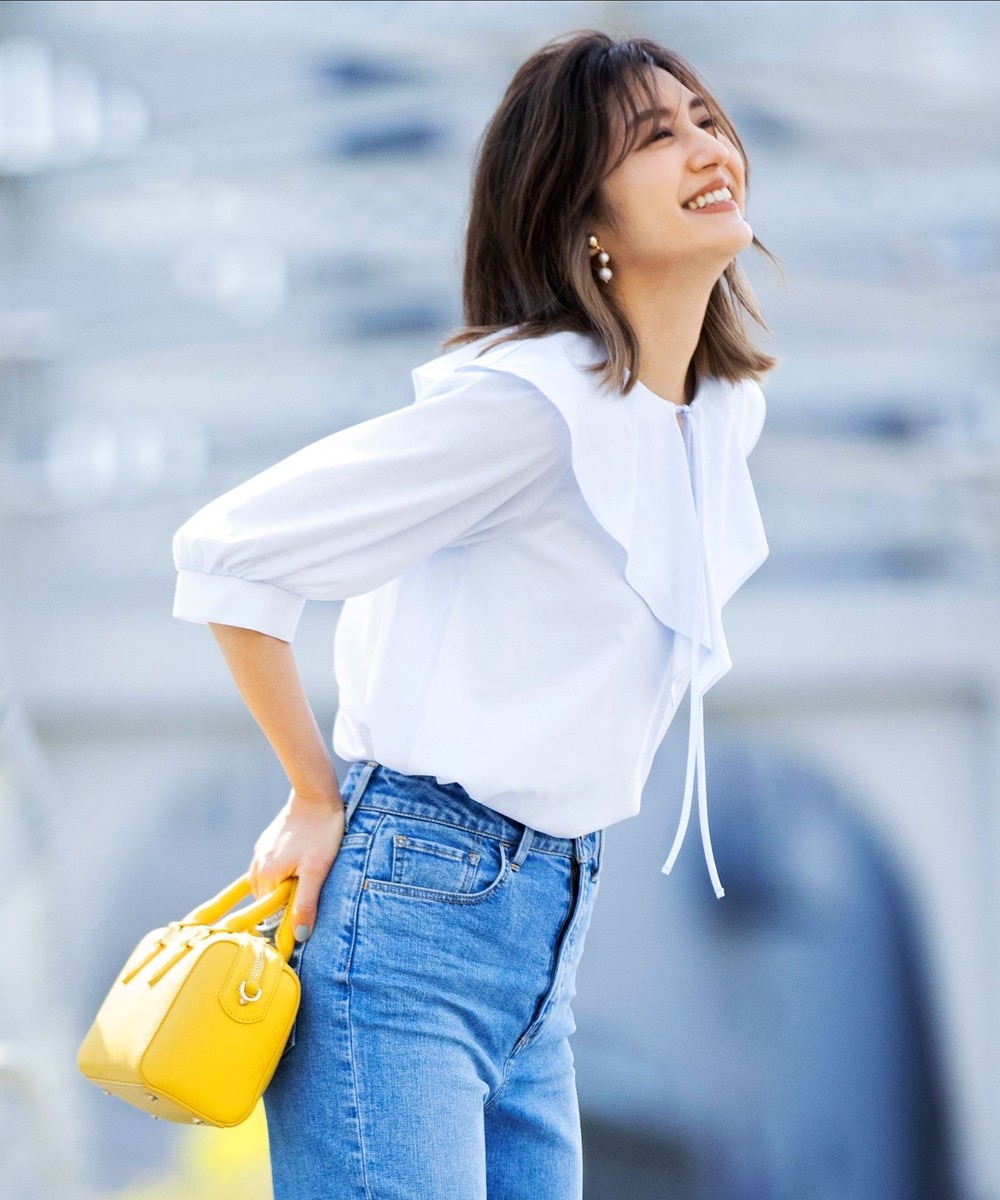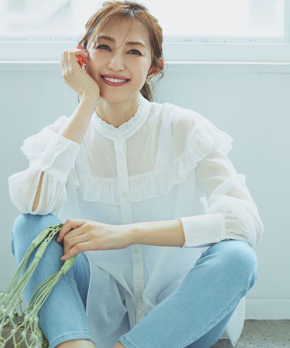 袖口や、前立てにシャツディテールを入れることで、甘くなりすぎず着回ししやすい大人のフリルブラウスです。