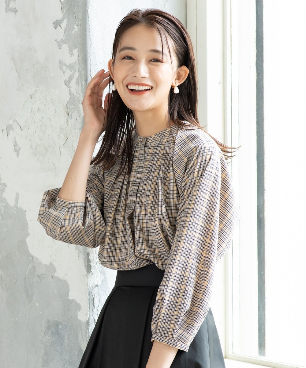 送料無料 2021AWカジュアルな印象になりすぎない、タック使いがキレイなプリントブラウス■デザインドルマン型のデシン素材のブラウスです。