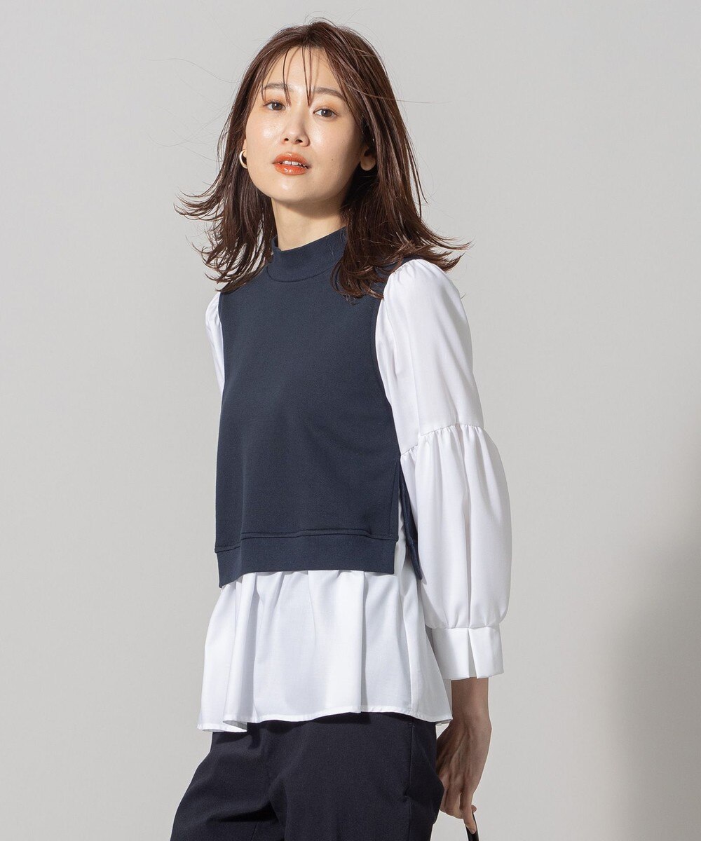 ふんわりスリーブブラウスとスエットのレイヤード風で、脇に入ったスリットからブラウスがのぞくようなデザインになっています。