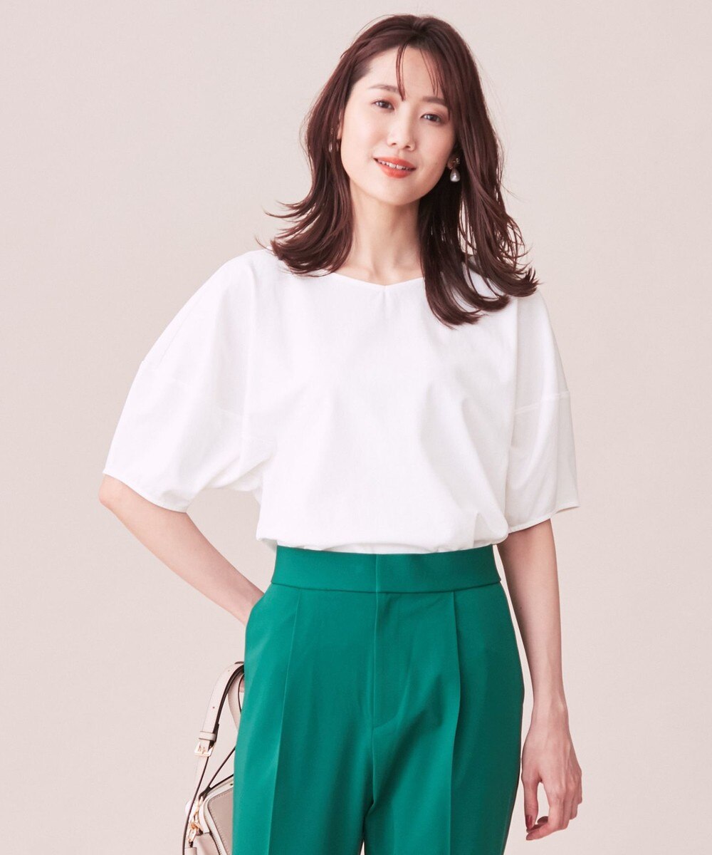 程よくゆったりとしたリラックスボディは体のラインを拾いにくく、浅めのVネックラインがデコルテをきれいに見せてくれます。