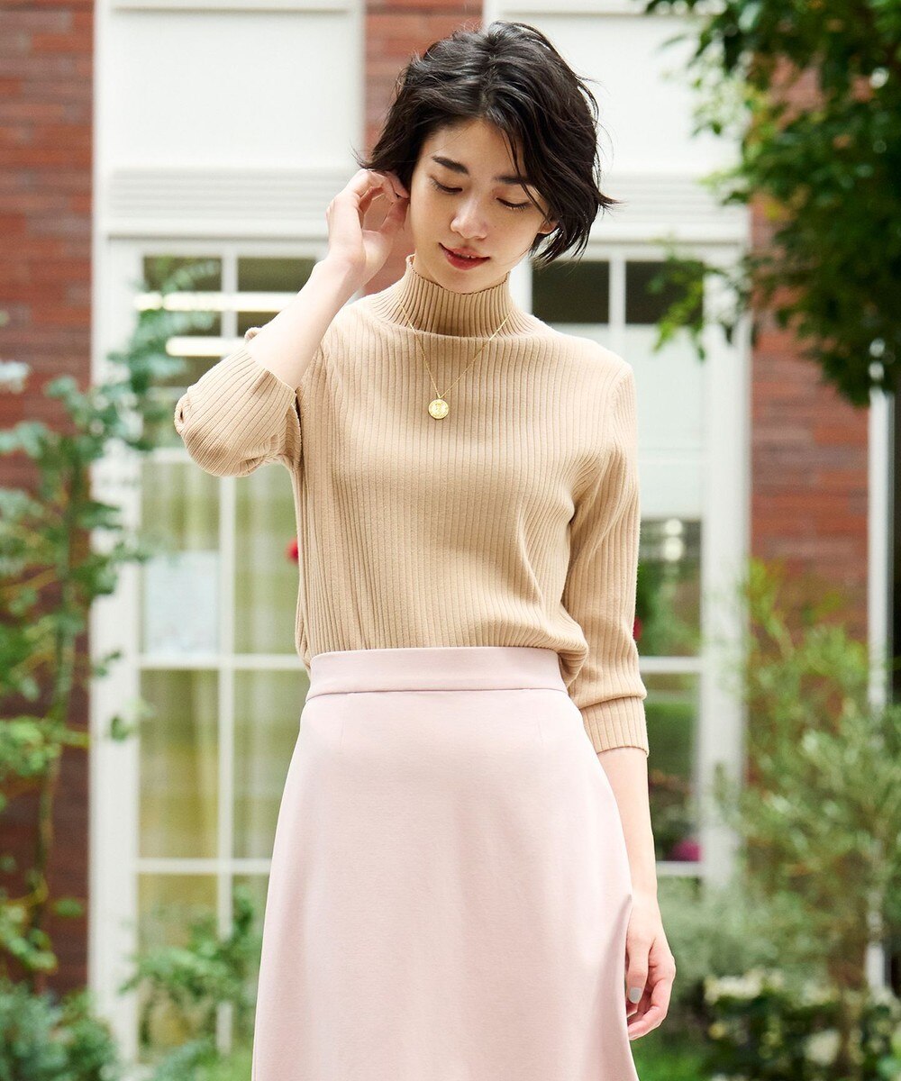 送料無料 2021AWバックネックのパールボタンがポイント、ラインを拾いすぎずきれいに着られるリブニットプルオーバー■デザイン汎用性の高いシンプルなハイネックのリブプルオーバー。