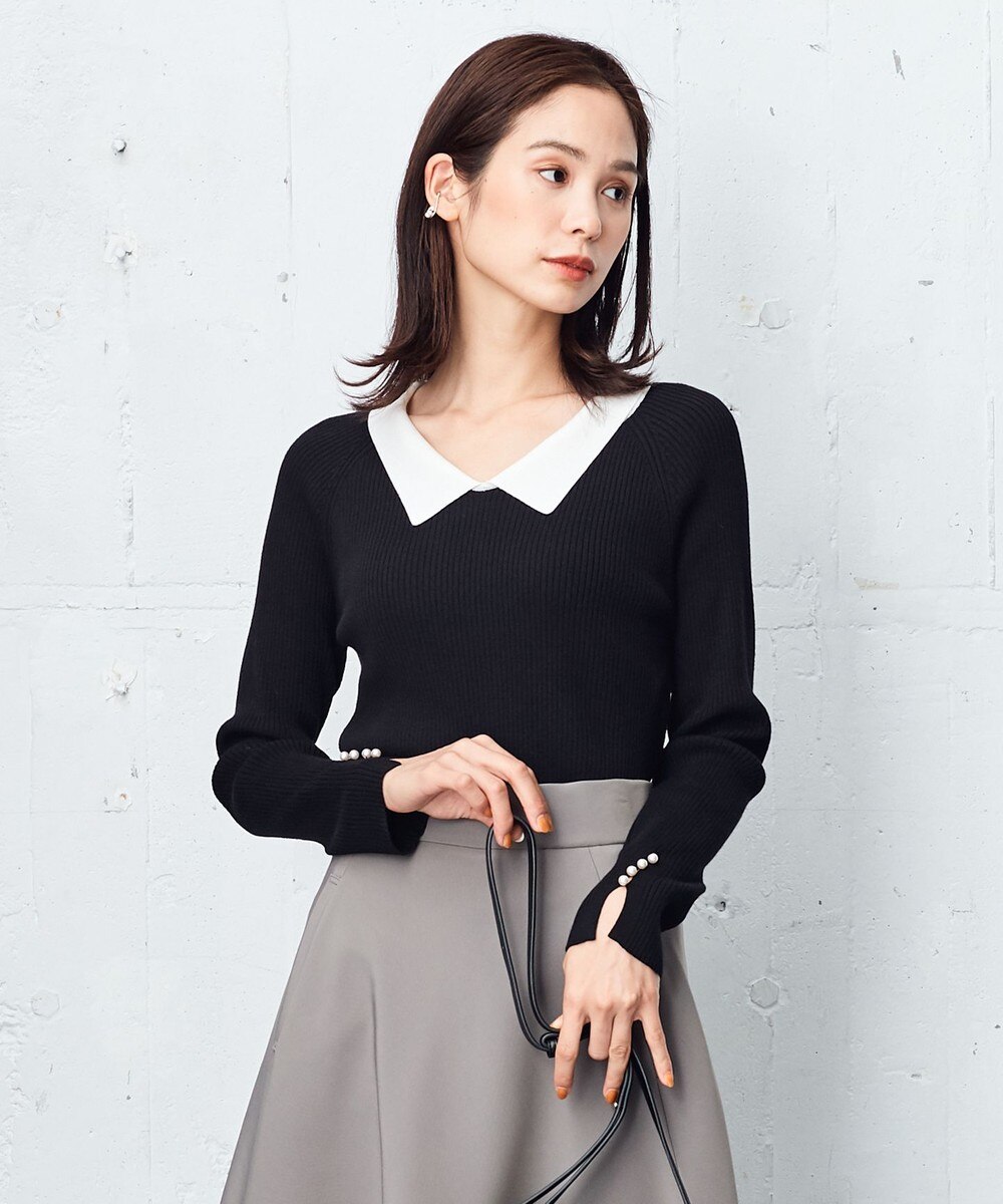 送料無料 2021AWデコルテラインが綺麗に見える、クラシカルなリブニット■デザインクラシカルな襟デザインのリブニット。