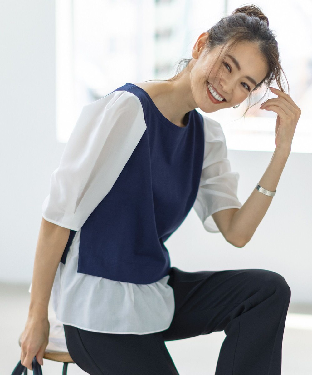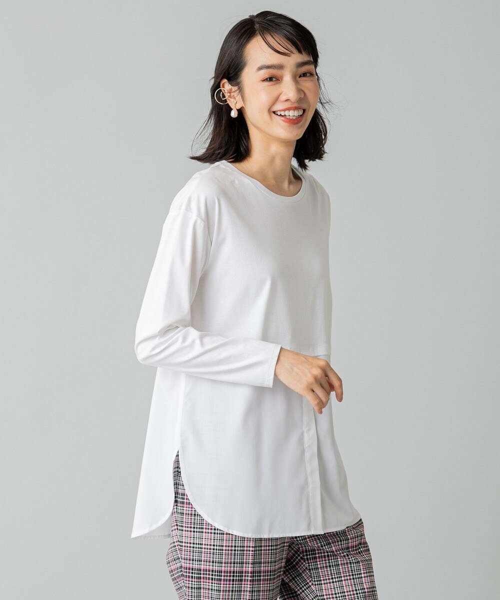 送料無料 30%OFF 2021SS一枚でらくらくお洒落見え!人気商品のレイヤード風トップスが夏素材で登場!!■デザイン袖と裾に少し透け感のある布帛素材をドッキングした1枚で決まるトップスです。