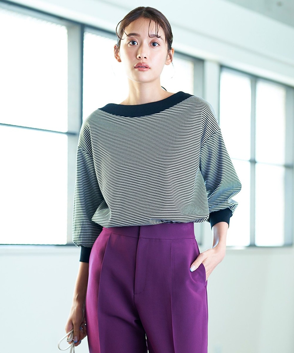 デコルテラインを程よくきれいに見せてくれるボートネックが女性らしく見せてくれ、インでもアウトでも決まる一枚です。