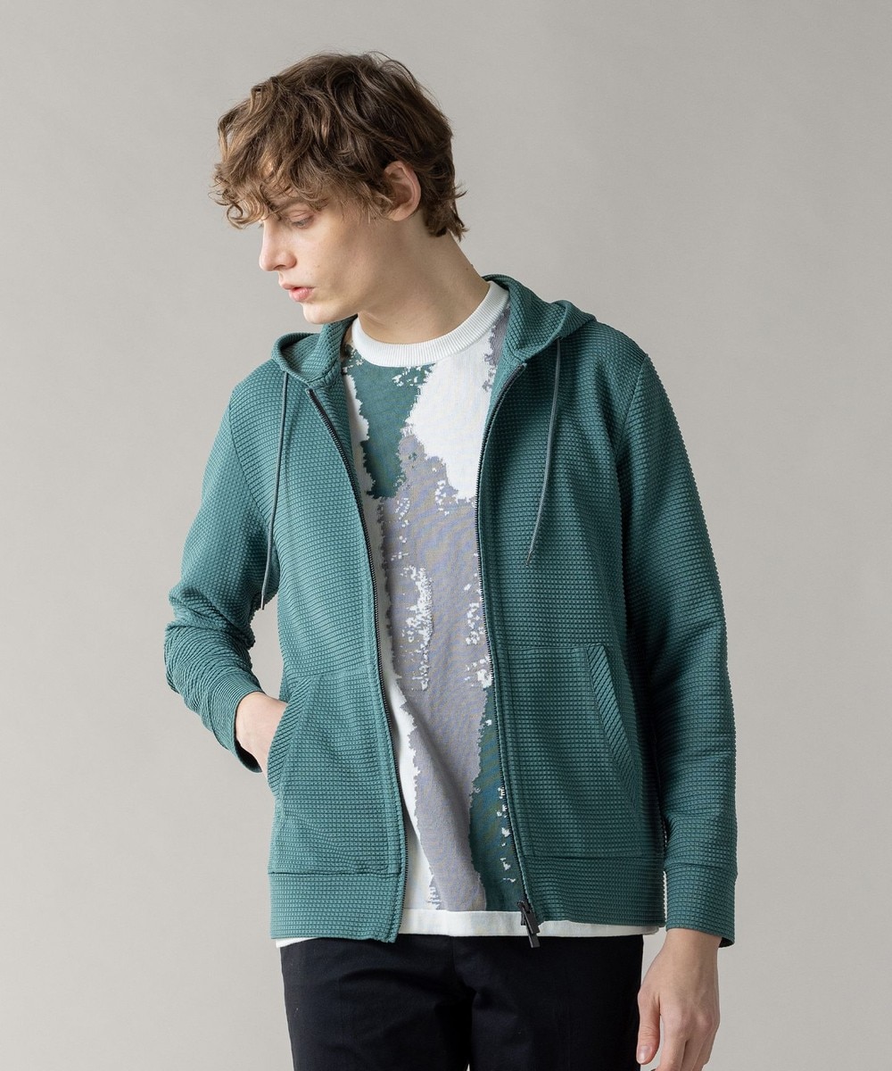 前身頃、袖部分には幾何学メッシュジャカード生地を使用。
